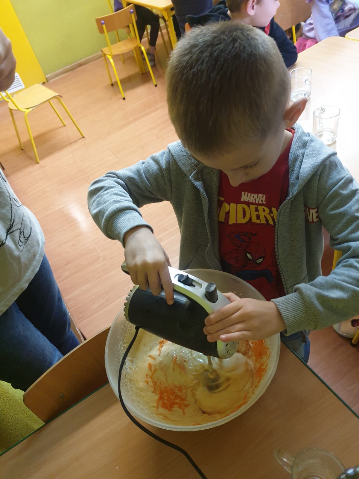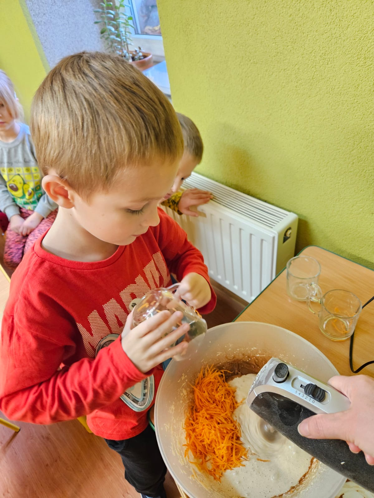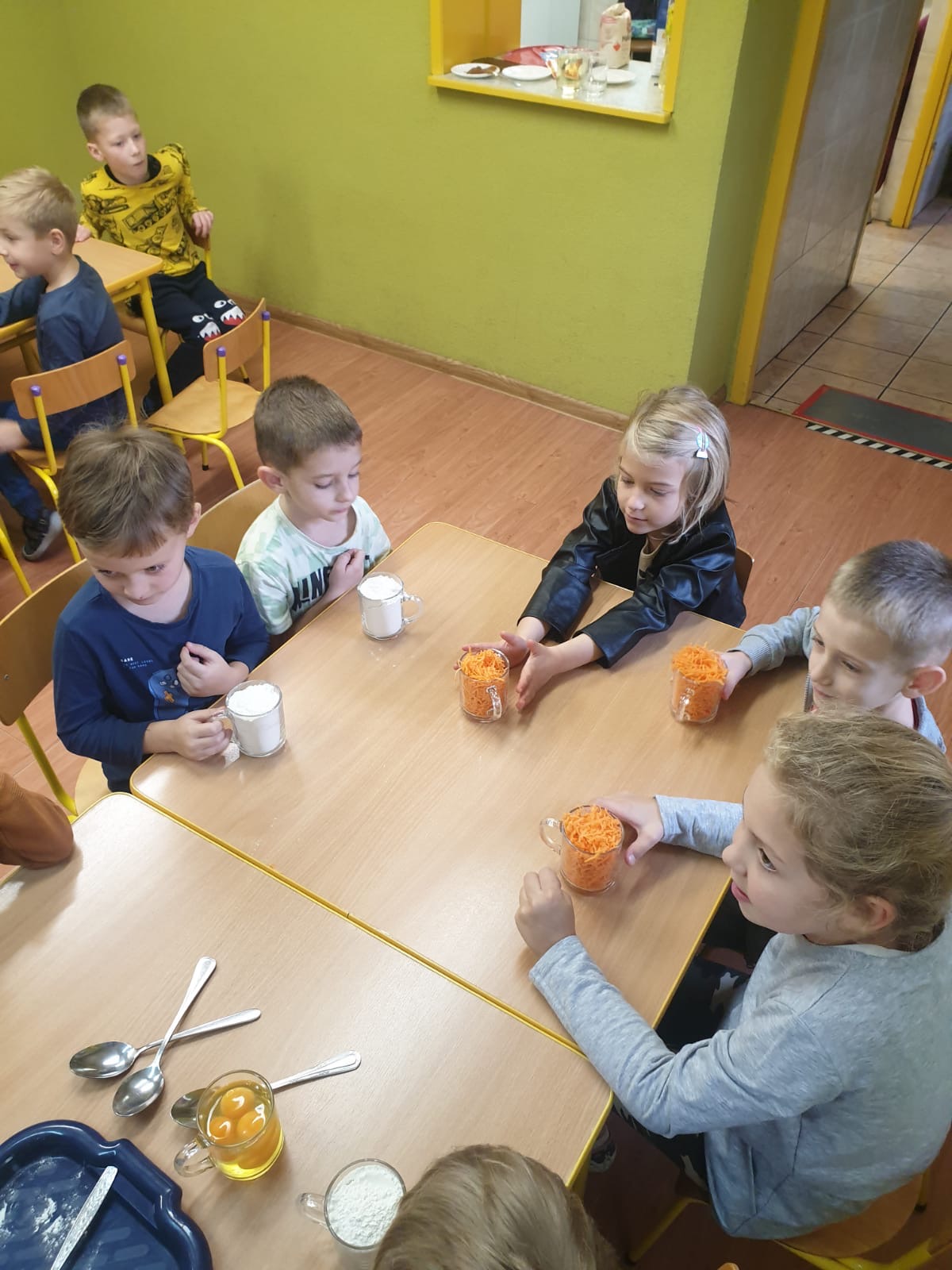 Dzieci z grupy " Malinki" wraz z wychowawcą, piekły ciasto marchewkowe dla zaproszonych gości, na uroczyste otwarcie "Pracowni pod chmurką" w ramach programu " Akademia młodego ekologa".