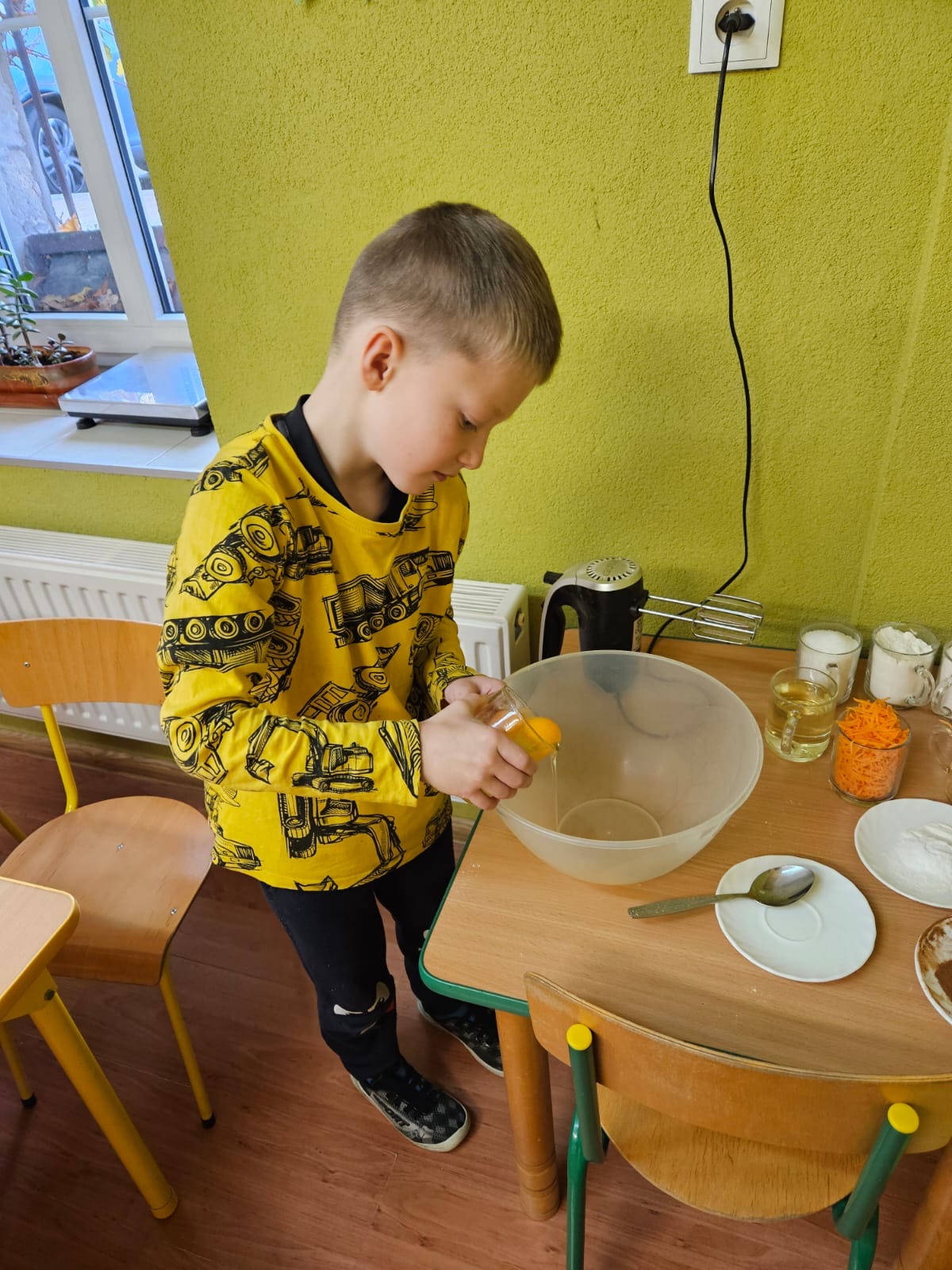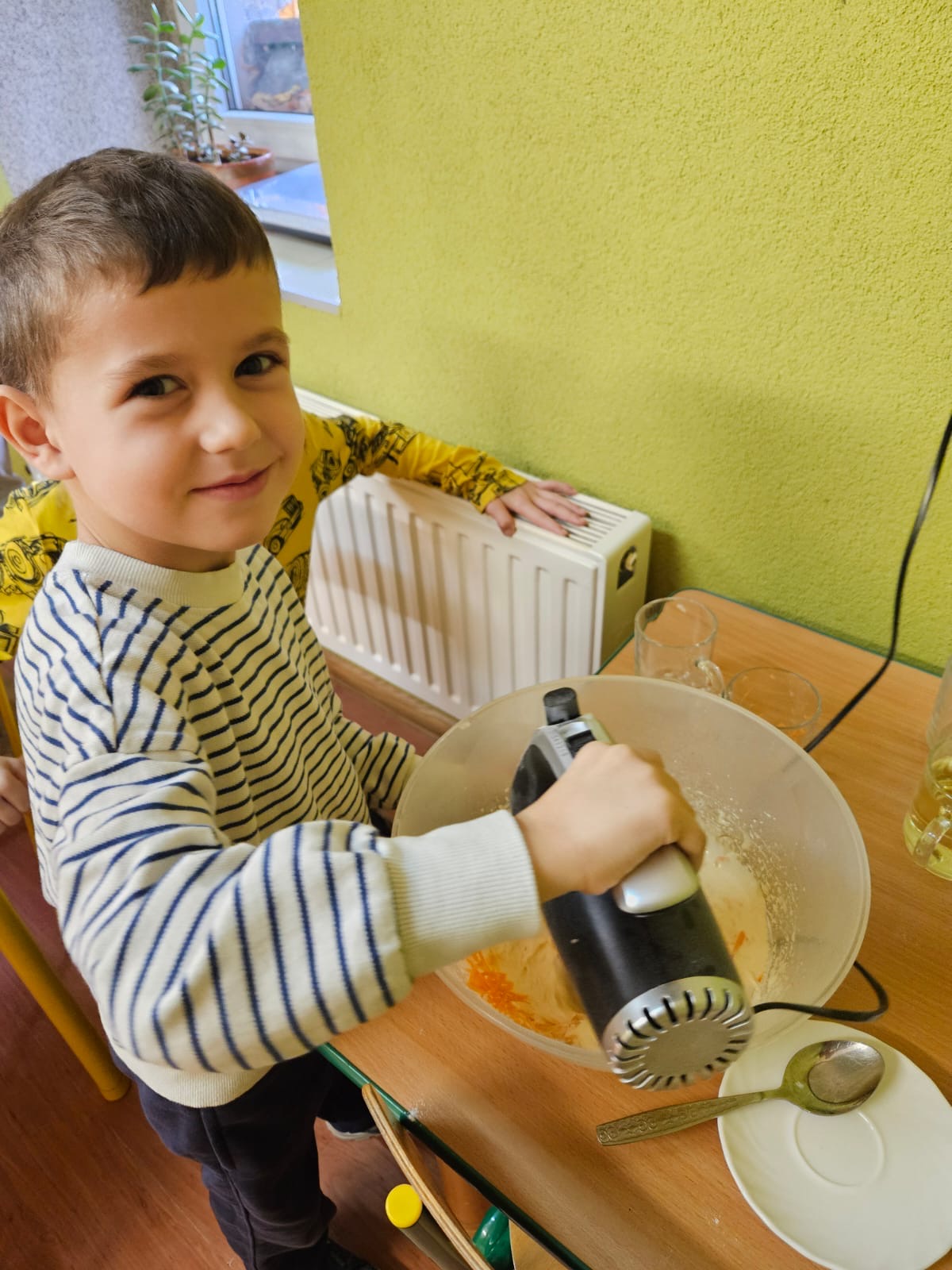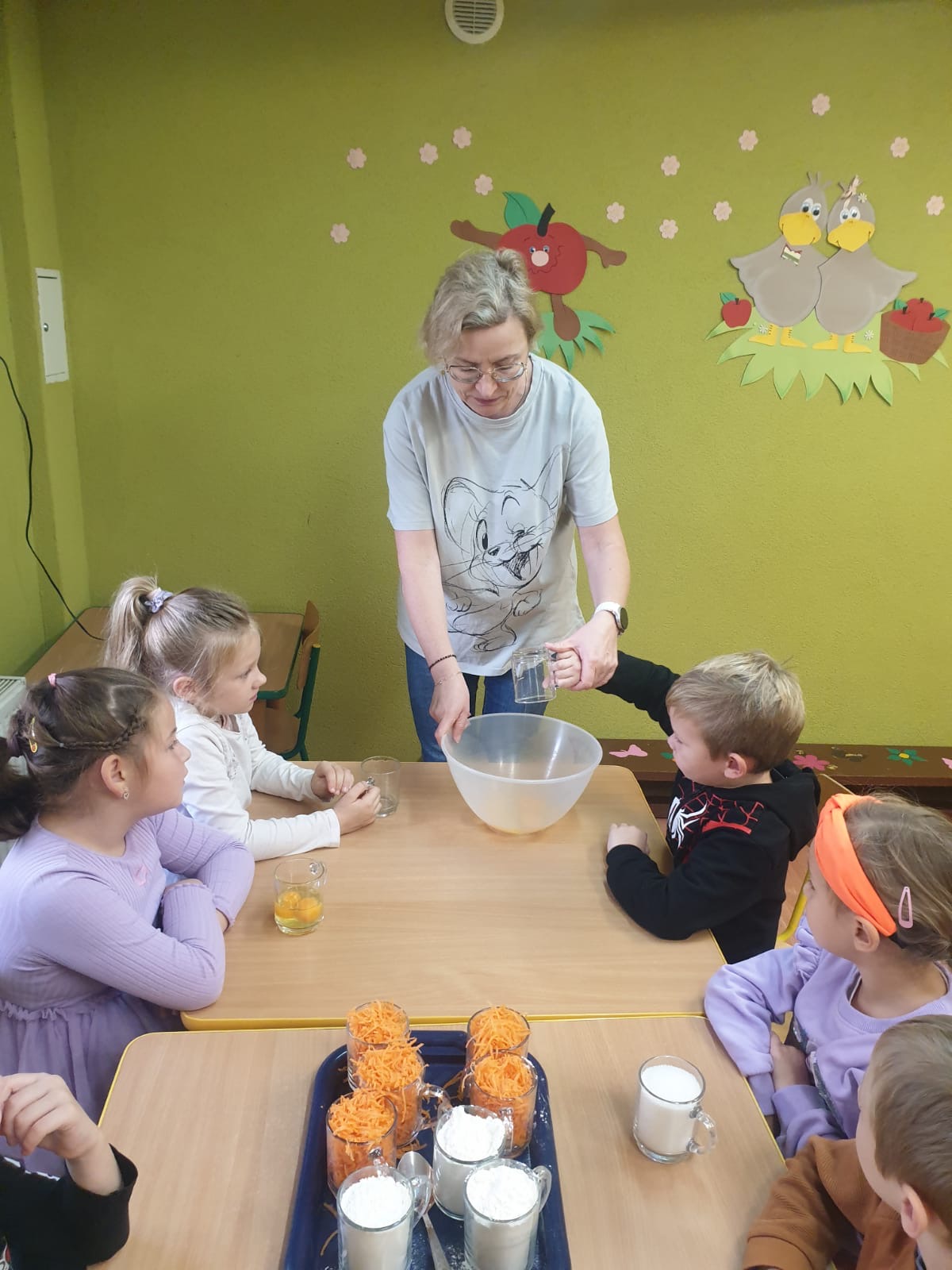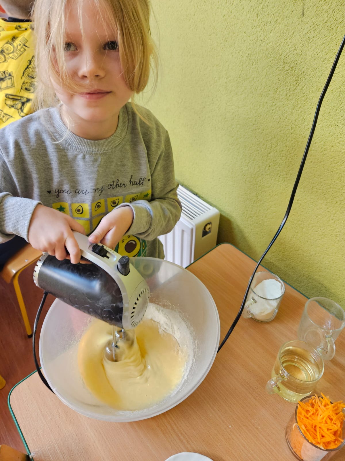 Dzieci z grupy " Malinki" wraz z wychowawcą, piekły ciasto marchewkowe dla zaproszonych gości, na uroczyste otwarcie "Pracowni pod chmurką" w ramach programu " Akademia młodego ekologa".