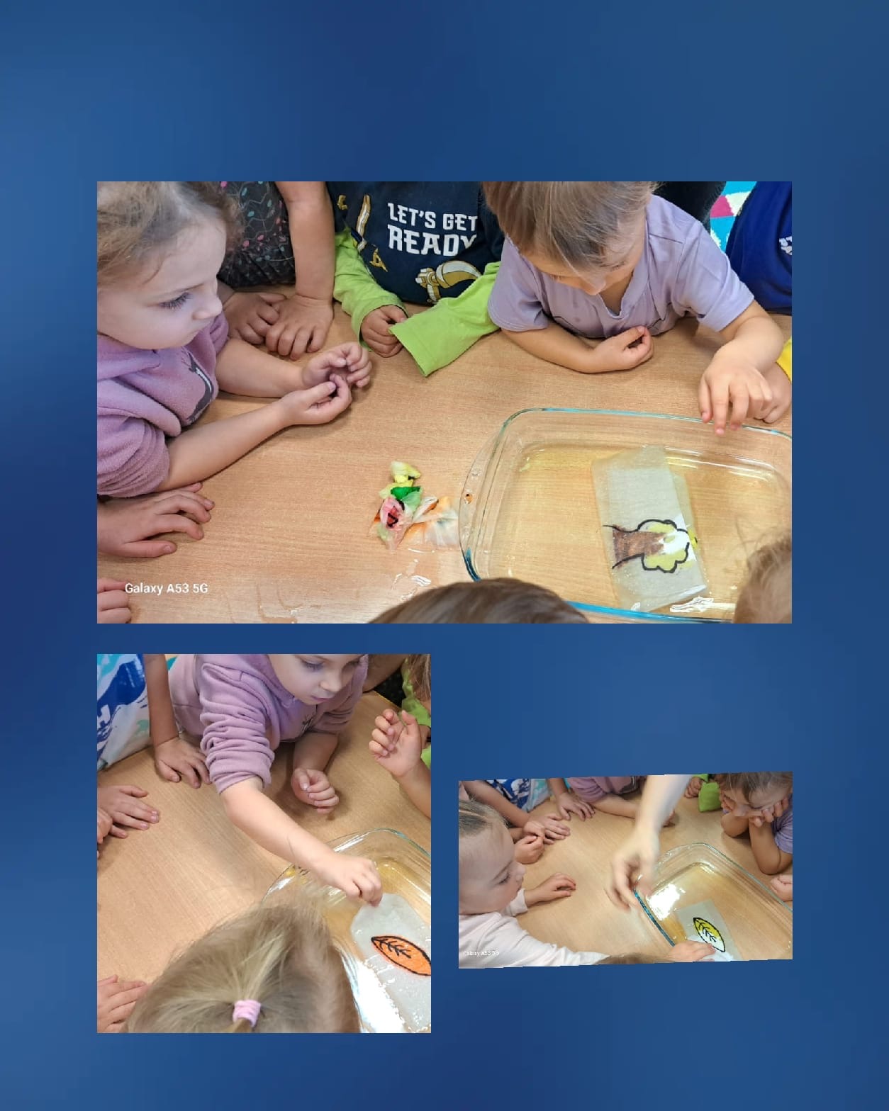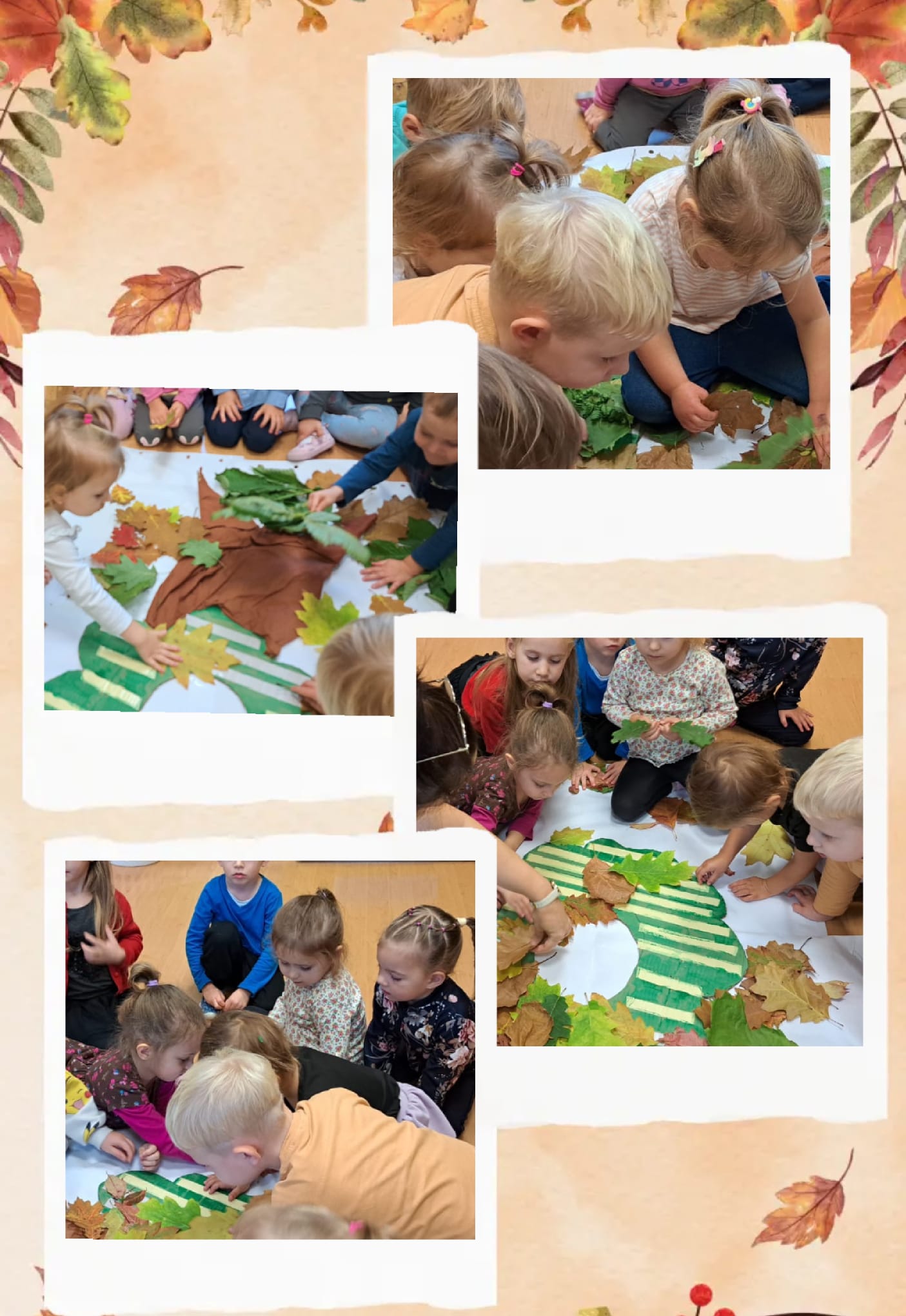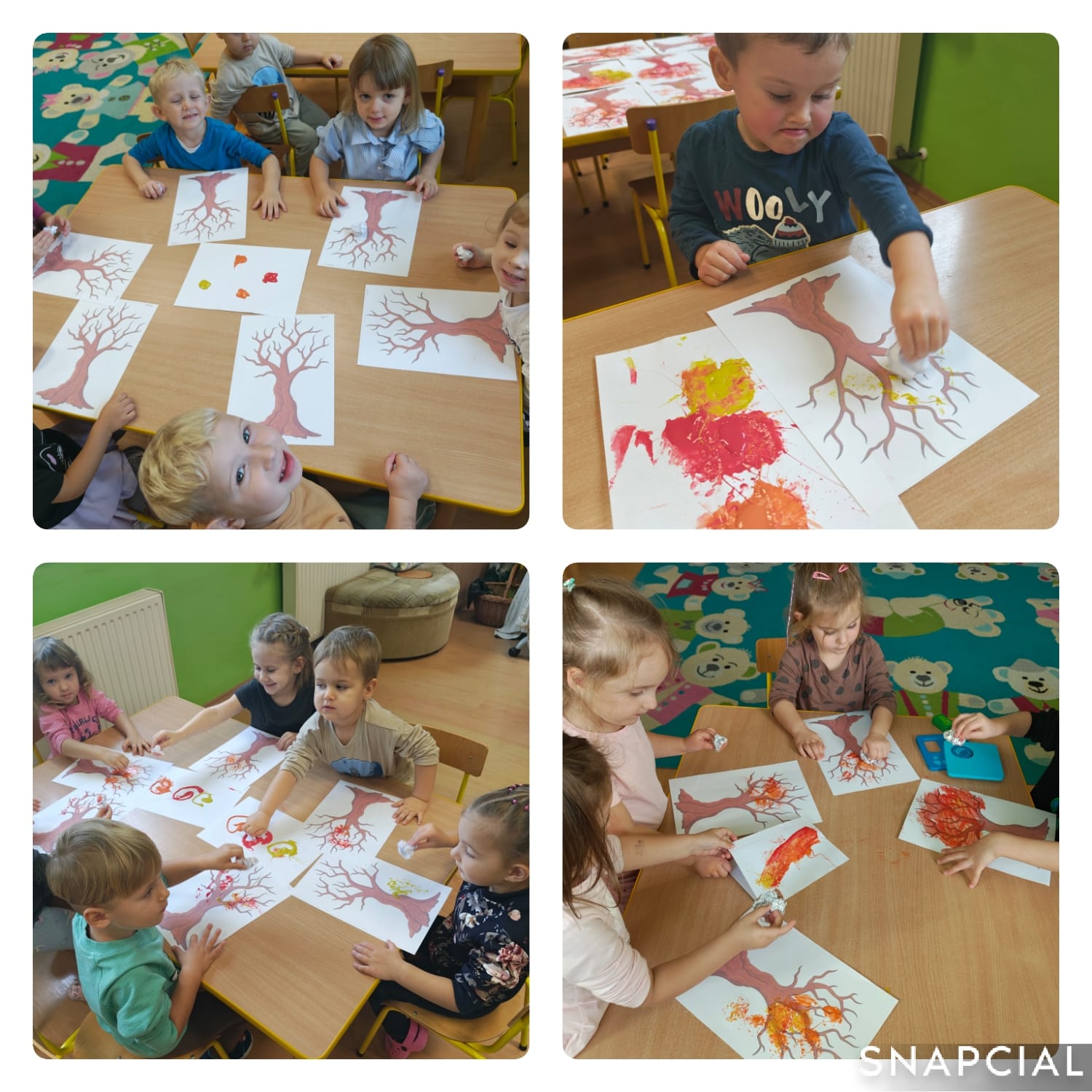 Nie zabrakło również twórczej zabawy – przedszkolaki wykonały piękne prace plastyczne inspirowane drzewami i kolorowymi, jesiennymi liśćmi. Powstały wspaniałe drzewa z papierowych liści, stemplowane farbami korony i kolorowe kolaże.