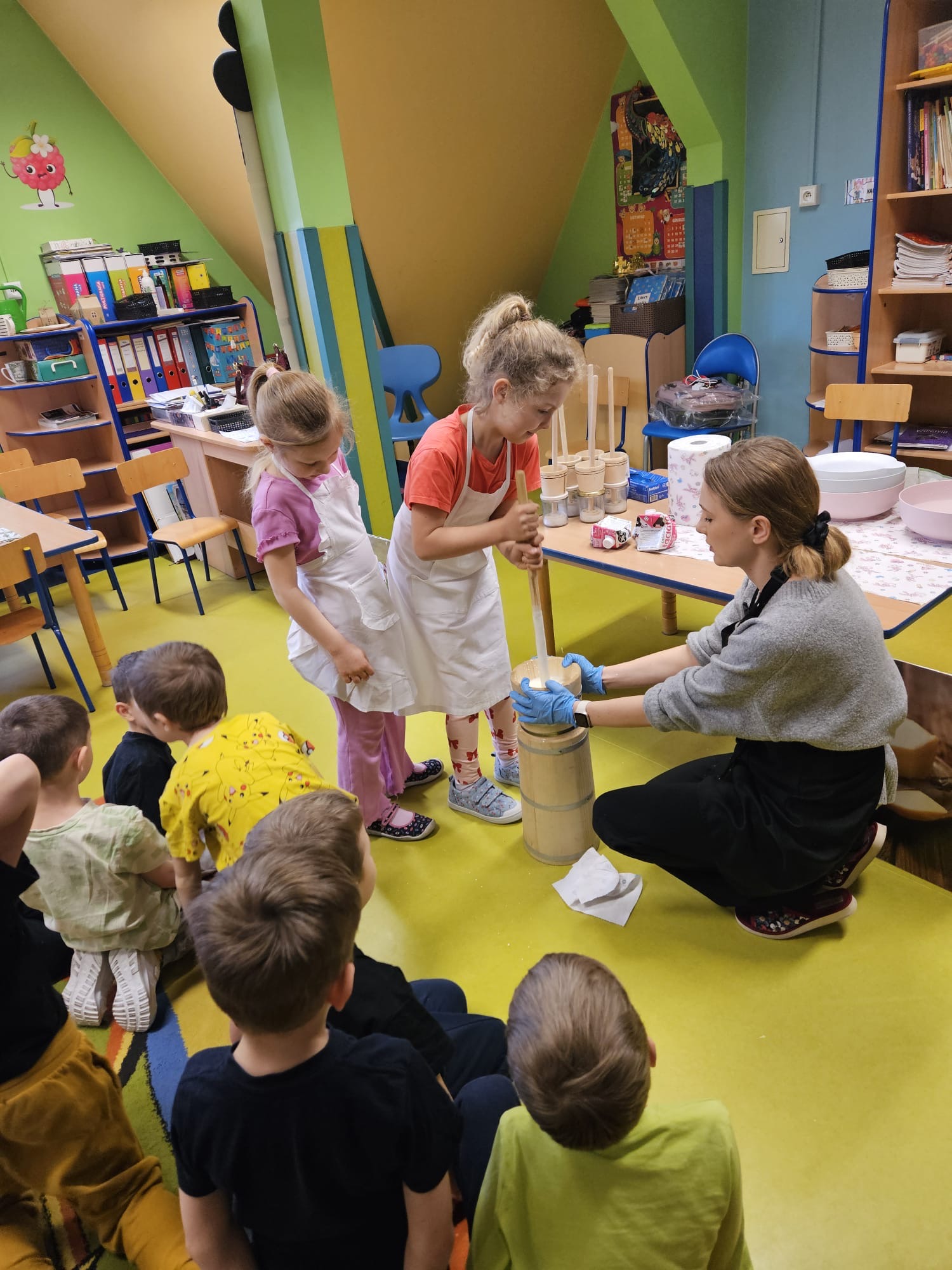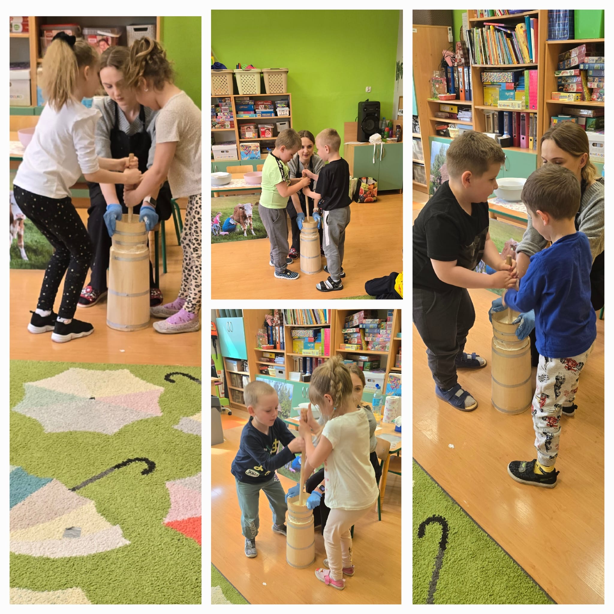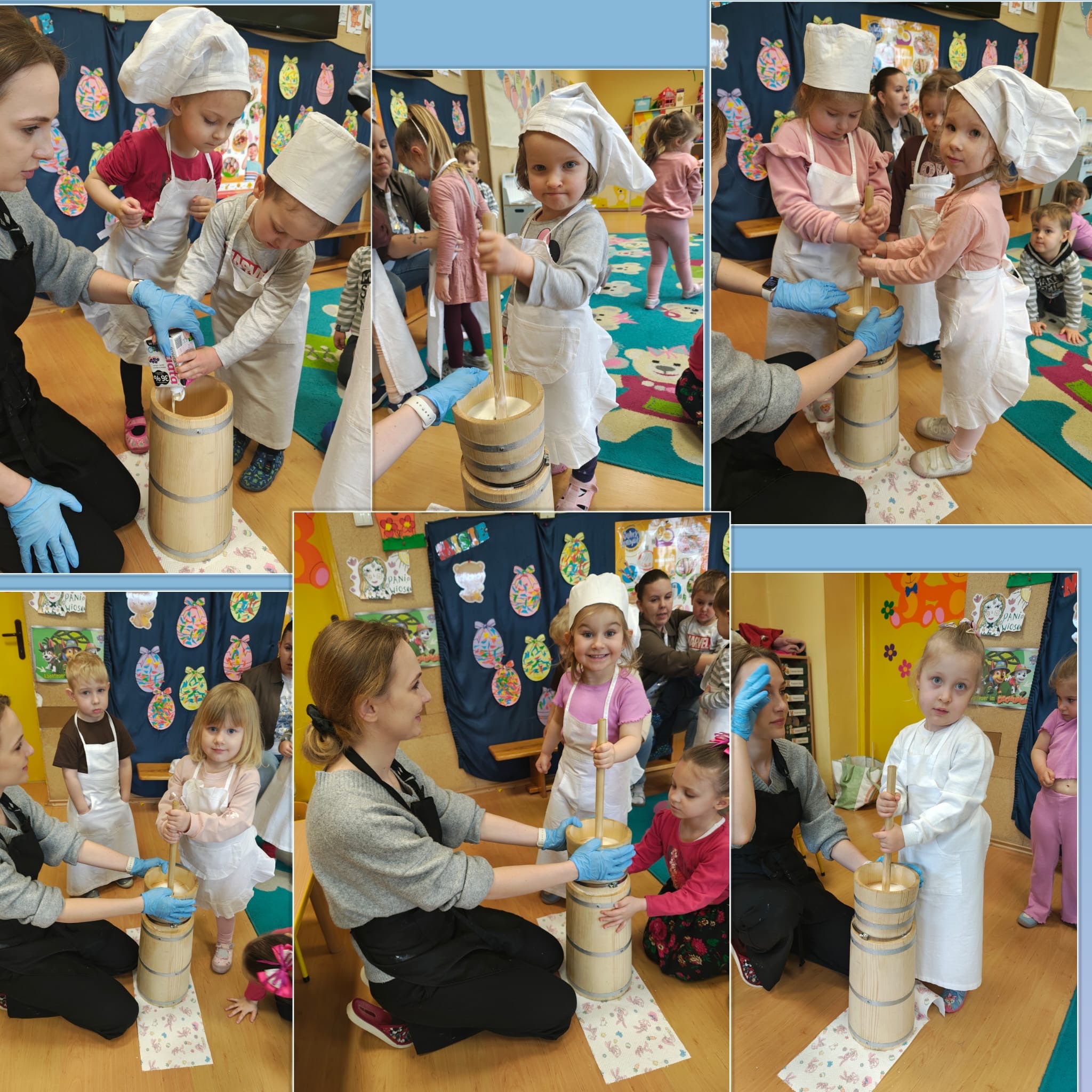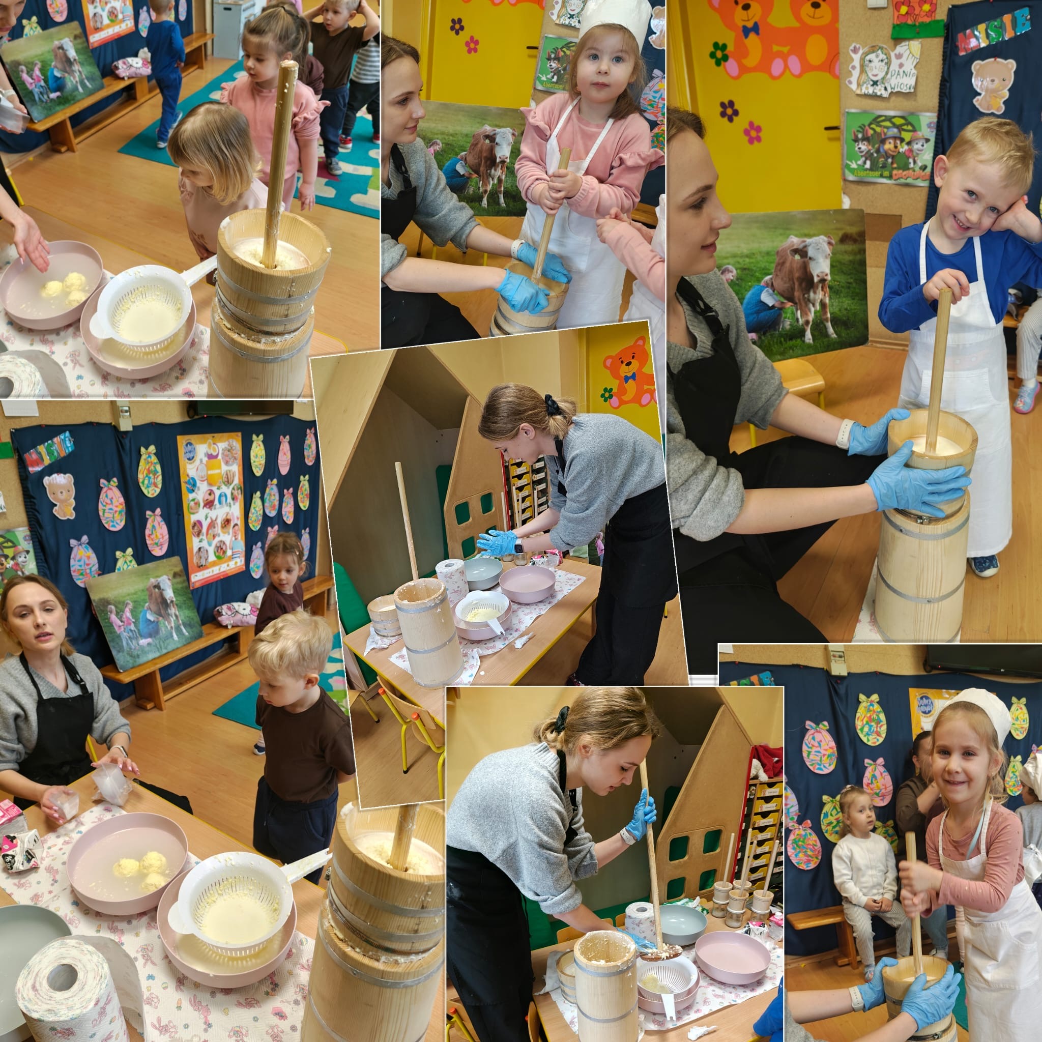 W dniu dzisiejszym w naszym przedszkolu odbyły się warsztaty maślane. Dzieci ze wszystkich grup miały okazję poznać proces powstawania masła – od śmietany aż po gotowy produkt. Podczas zajęć przedszkolaki z dużym zaangażowaniem obserwowały kolejne etapy, a następnie samodzielnie wykonywały masło. Warsztaty dostarczyły dzieciom wielu wrażeń oraz cennej wiedzy poprzez bezpośrednie doświadczenie.