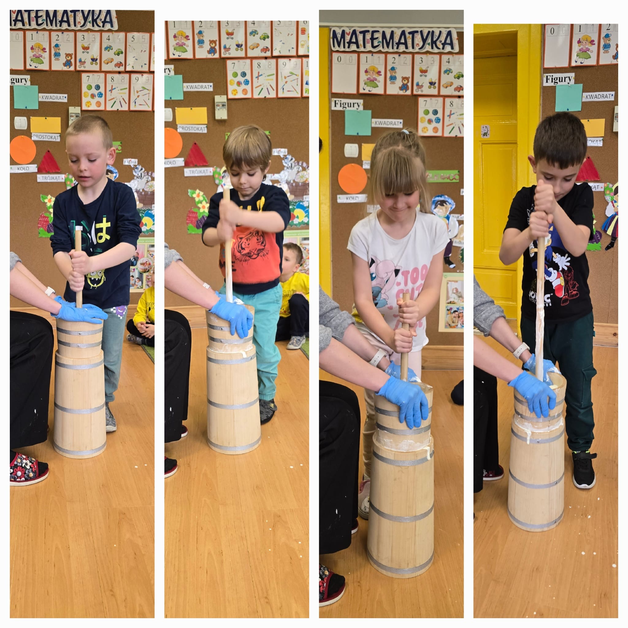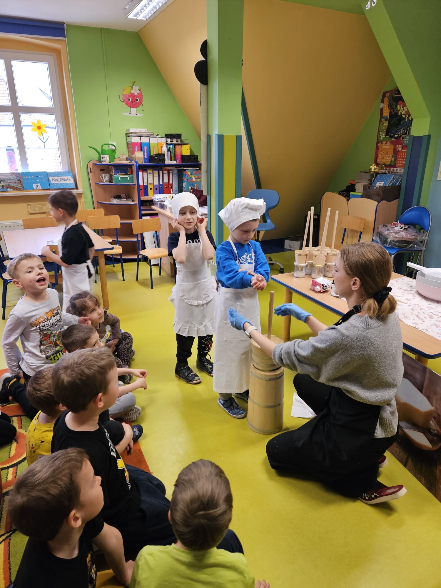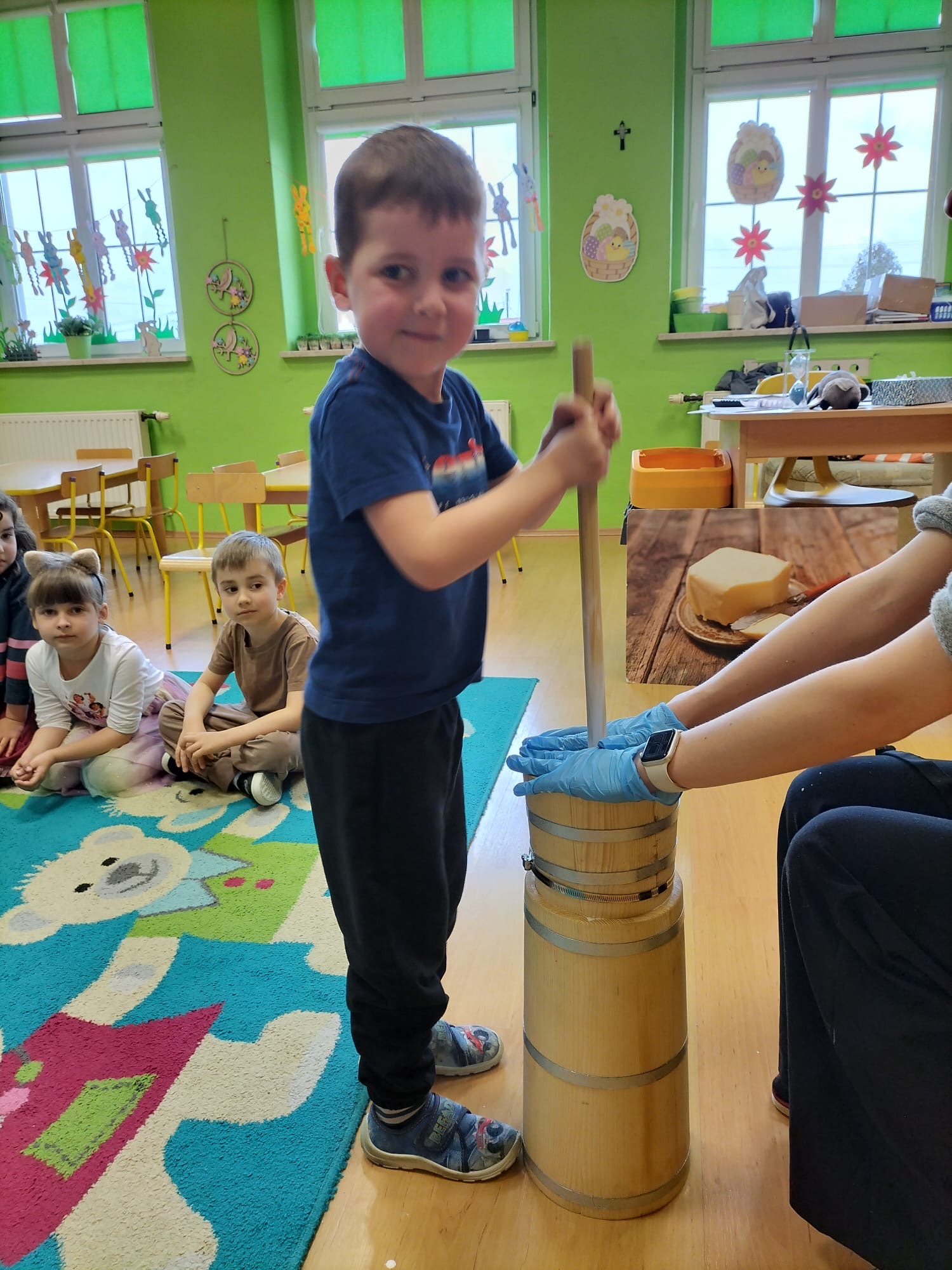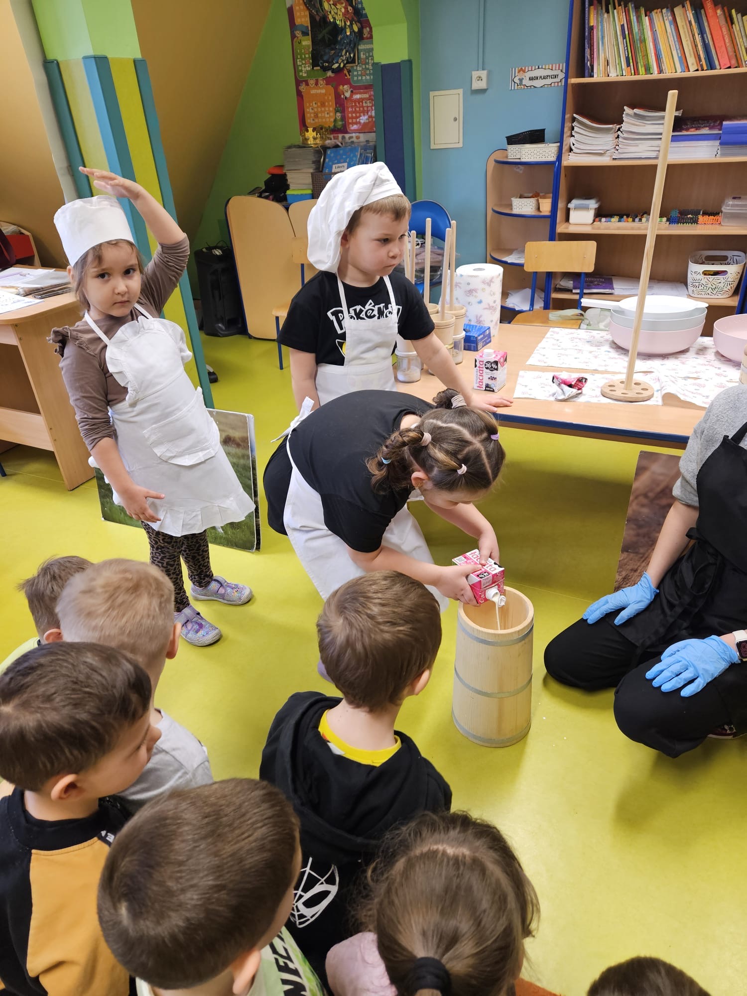 W dniu dzisiejszym w naszym przedszkolu odbyły się warsztaty maślane. Dzieci ze wszystkich grup miały okazję poznać proces powstawania masła – od śmietany aż po gotowy produkt. Podczas zajęć przedszkolaki z dużym zaangażowaniem obserwowały kolejne etapy, a następnie samodzielnie wykonywały masło. Warsztaty dostarczyły dzieciom wielu wrażeń oraz cennej wiedzy poprzez bezpośrednie doświadczenie.
