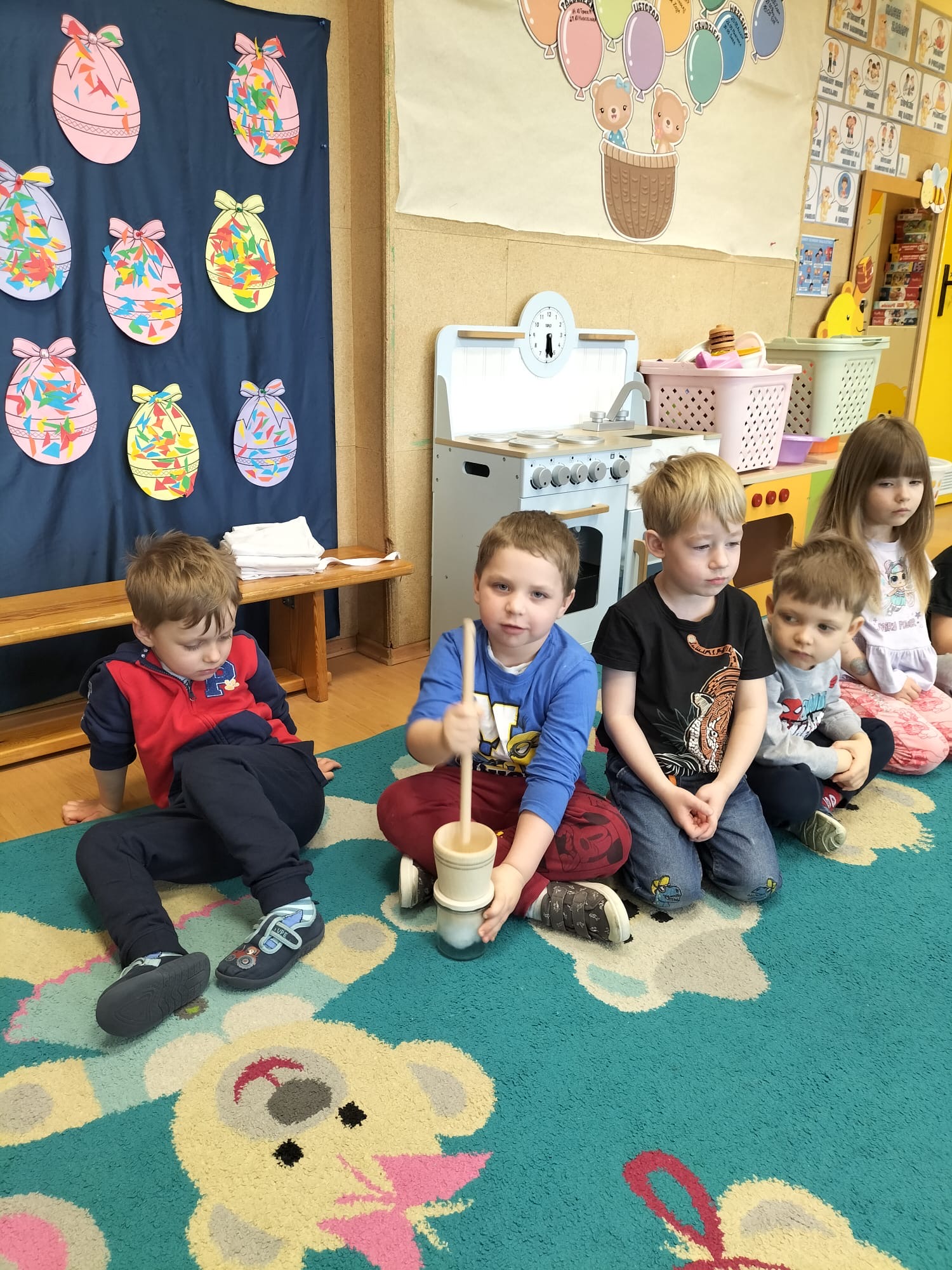 Dzieci z ogromnym zaangażowaniem ozdabiały wielkanocne babeczki, które z sercem przygotowali seniorzy. Kolorowe lukry, posypki i radosna atmosfera sprawiły, że każde wypieki stały się małymi dziełami sztuki. Spotkanie uświetnił piękny śpiew przedszkolaków.